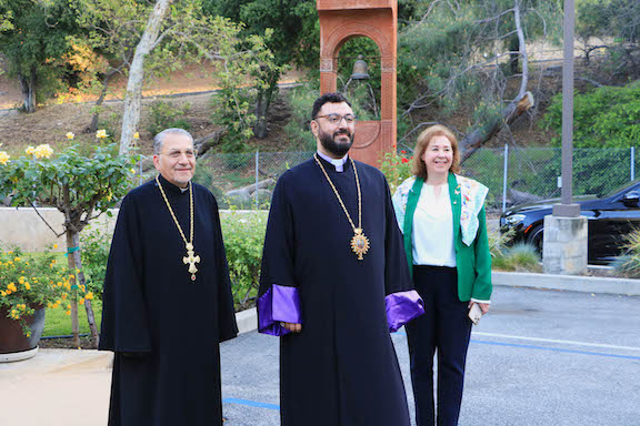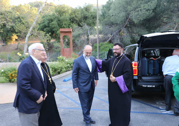 Once inside the Prelacy, Prelate Khatcherian was welcomed by outgoing Prelate Archbishop Torkom Donoyan, Archpriest Razmig Khachadourian, the pastor of the Holy Martyrs Armenian Church in Encino, and Knar Kortoshian, the Chancellor of the Western Prelacy.